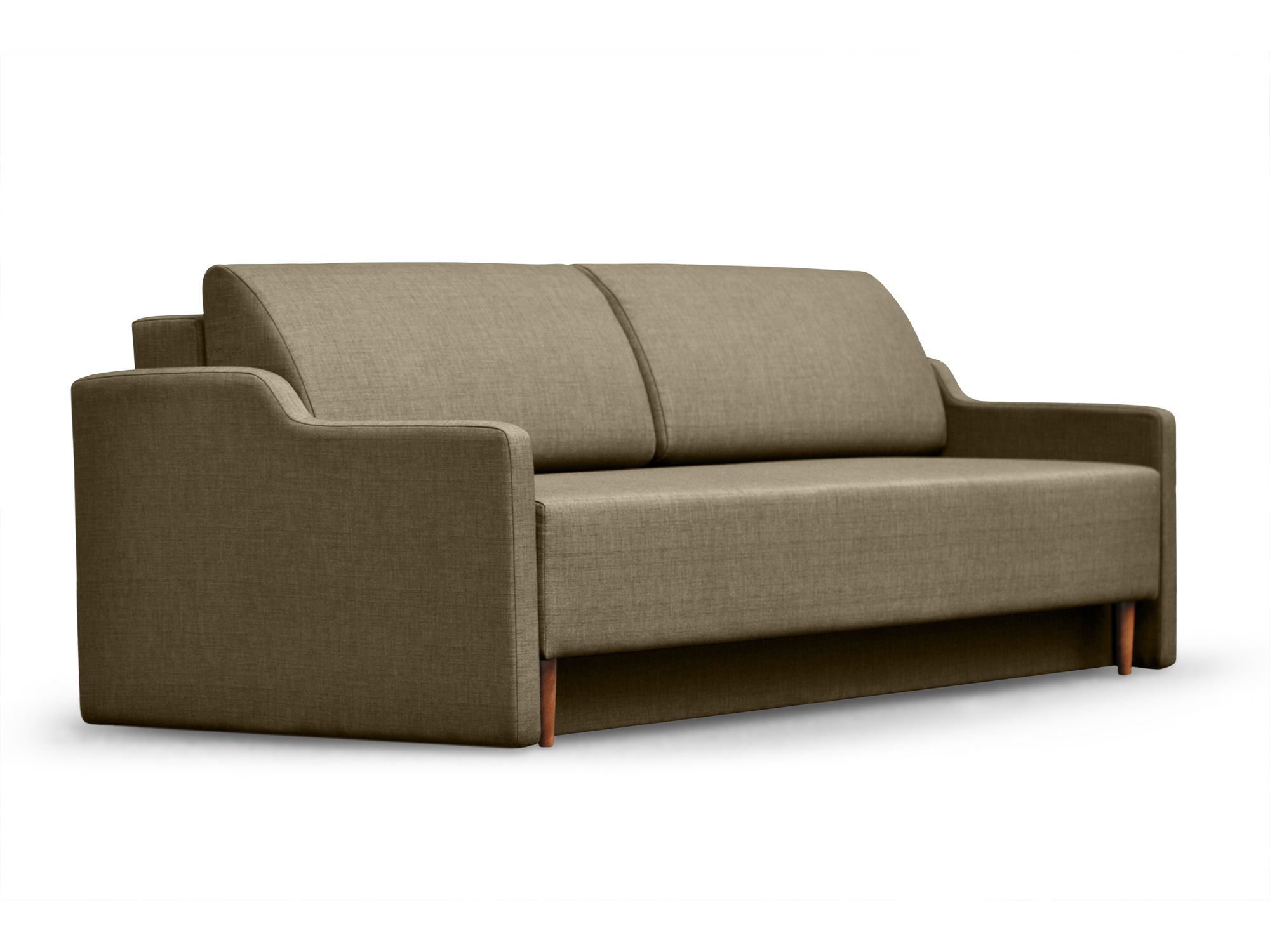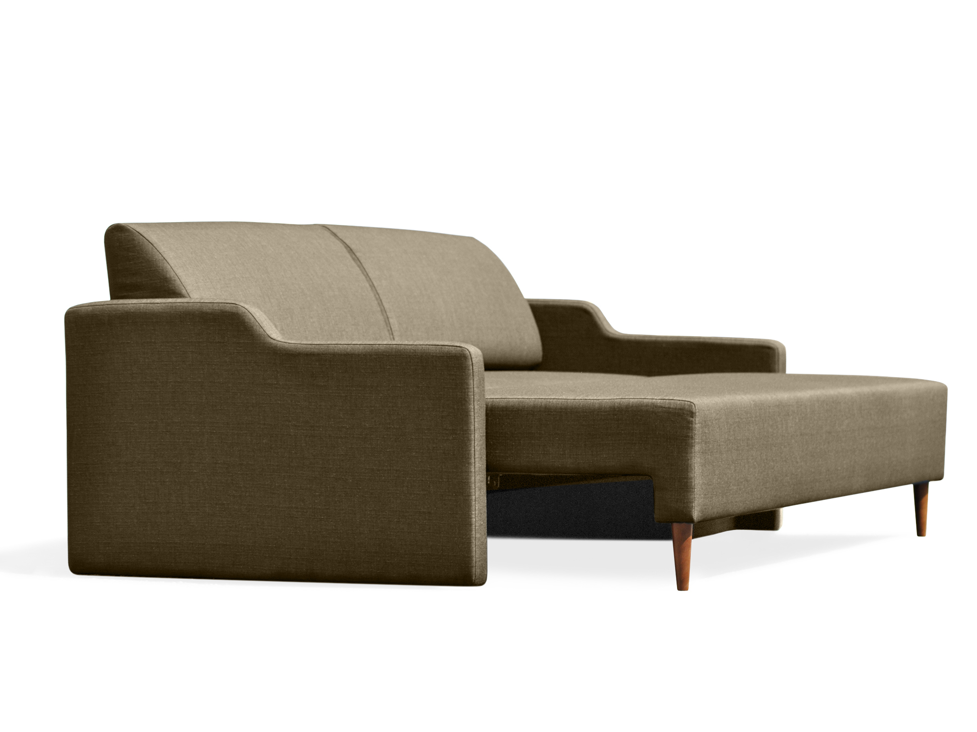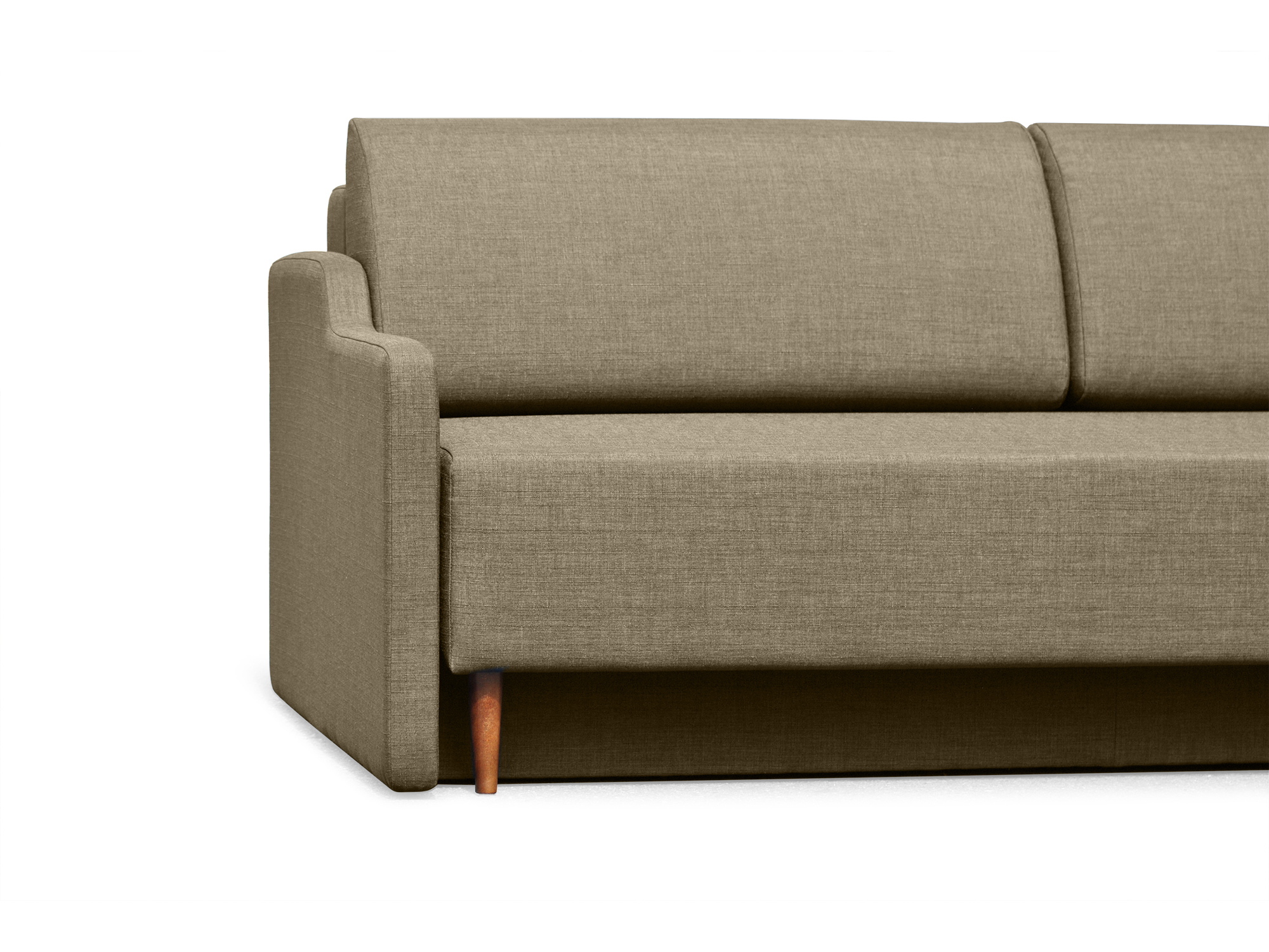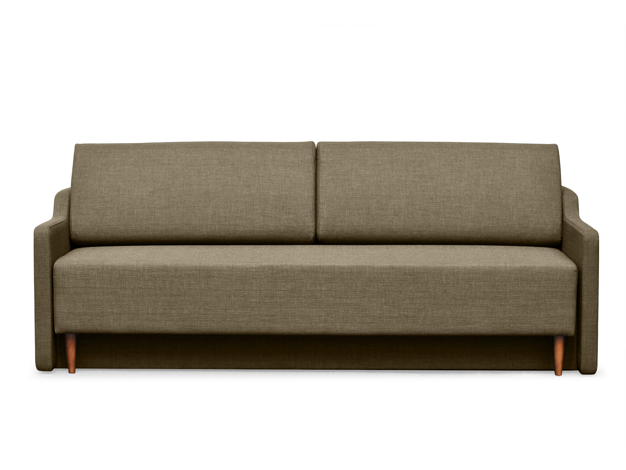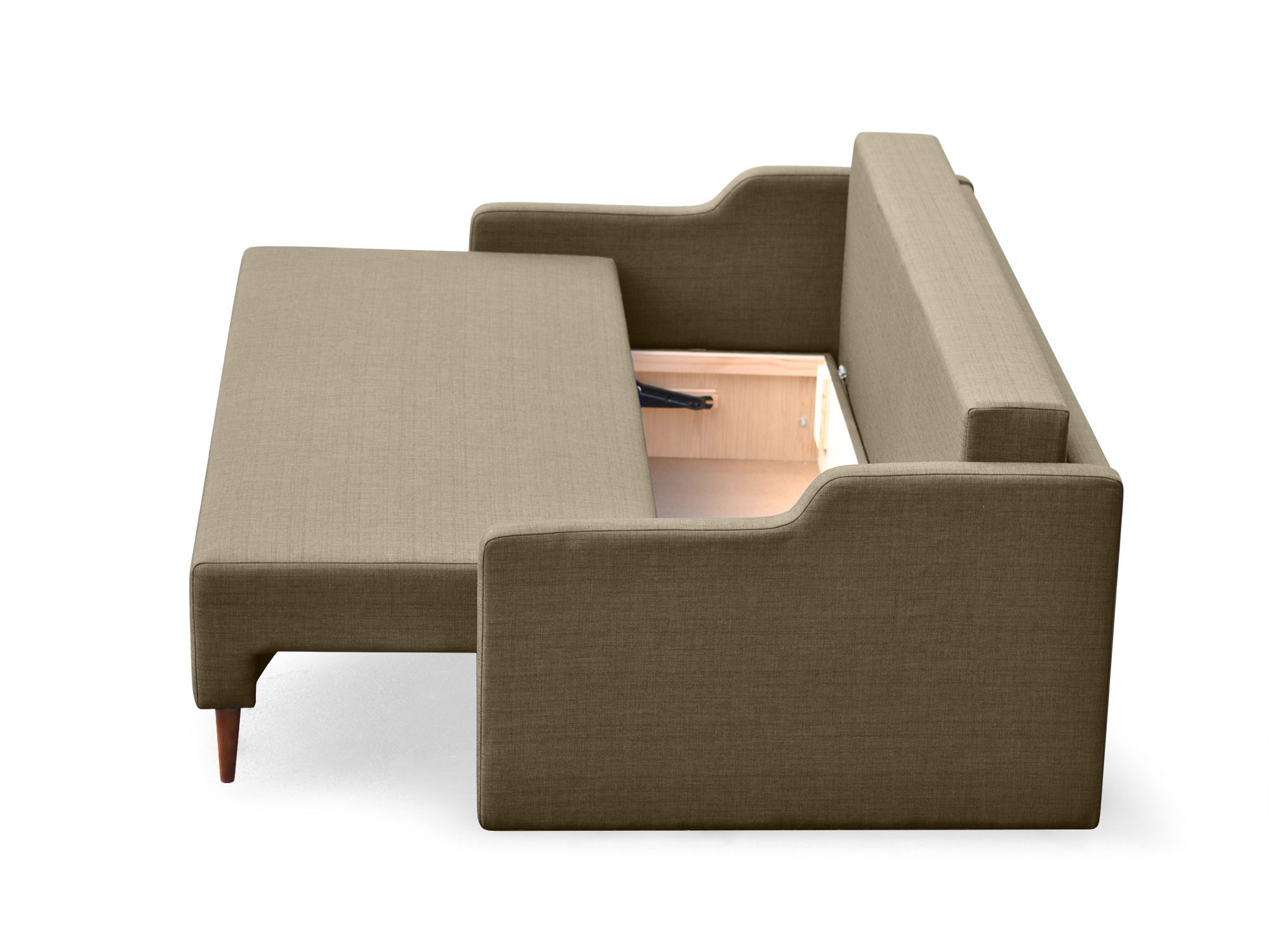 Cozy & bright fabric upholstery of Oslo Mid-Century Modern Sofa Bed in Almond will suit any living room set-up. A functional design offers a convenient place to lounge and rest by day and a cozy surface to sleep at night. It utilizes a reliable mechanism that allows the user a simple operation of transforming the couch. A storage space under the seating is a great place for coverlets, pillows and blankets. Minimalist yet refined look of this sleeper is adorned with a mid-century flair, which complement any room interior.