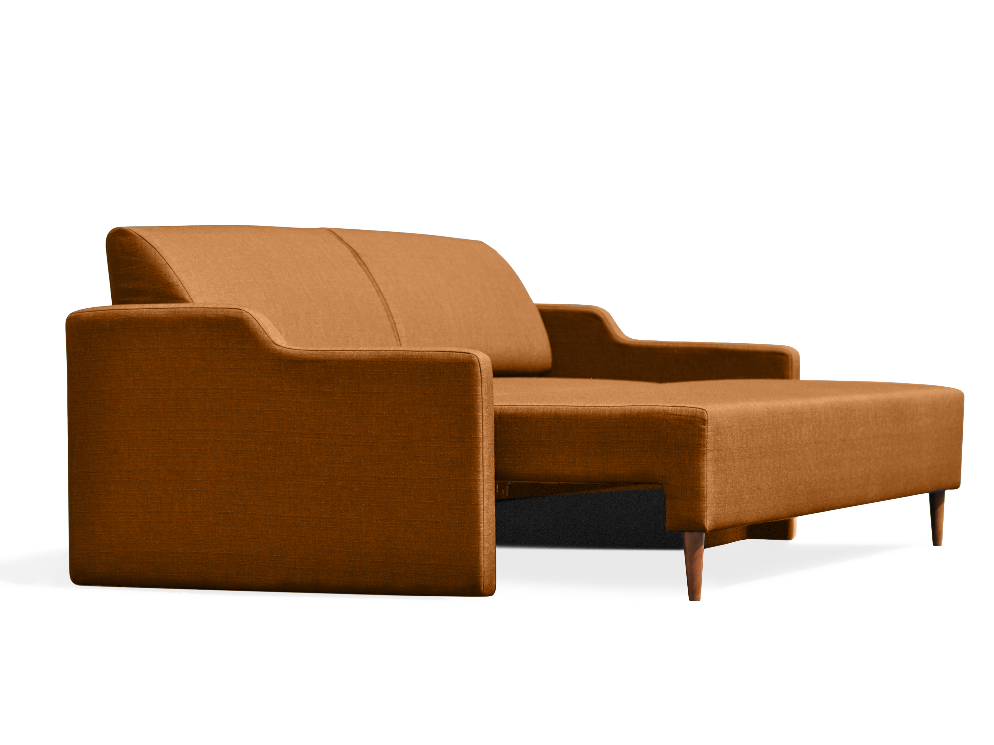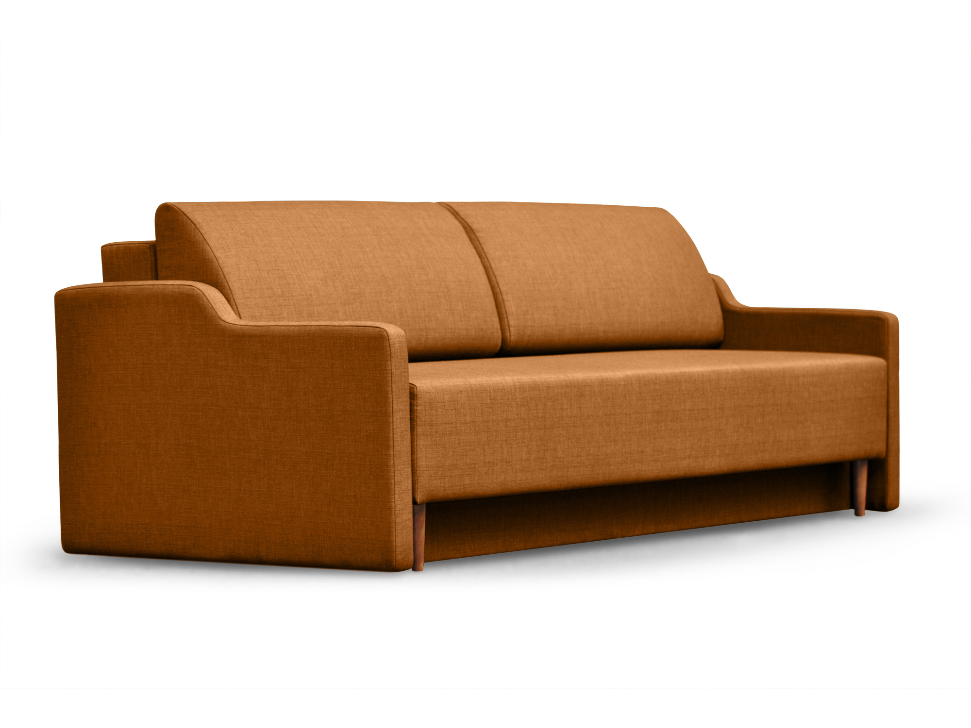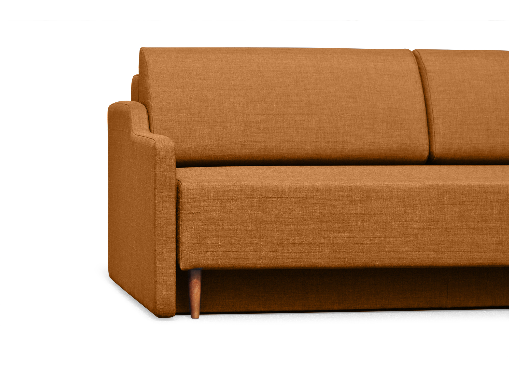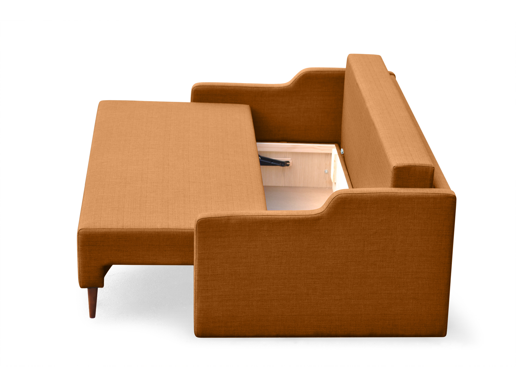 Oslo Sofa Bed in Apricot feature a bright fabric upholstery and will suit any living room set-up. A functional design offers a comfortable place to lounge and relax by day and a cozy surface to sleep at night. It utilizes a reliable mechanism that allows the user a simple operation of transforming the couch. A storage space under the seating is a great place for coverlets, pillows and blankets. Minimalist yet refined look of this sleeper is adorned with a mid-century flair, which complement any room interior.