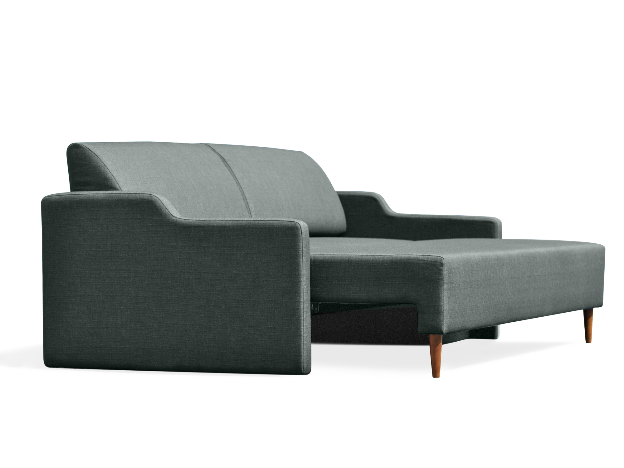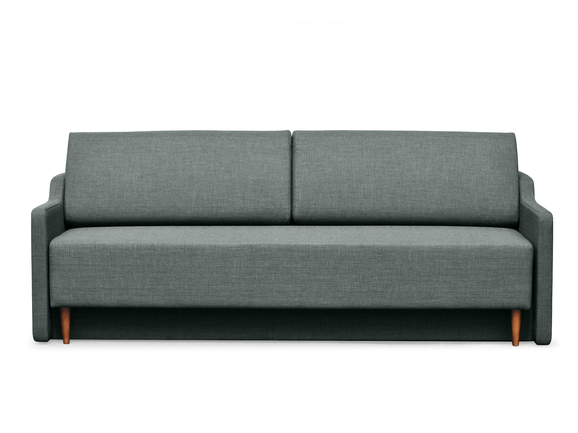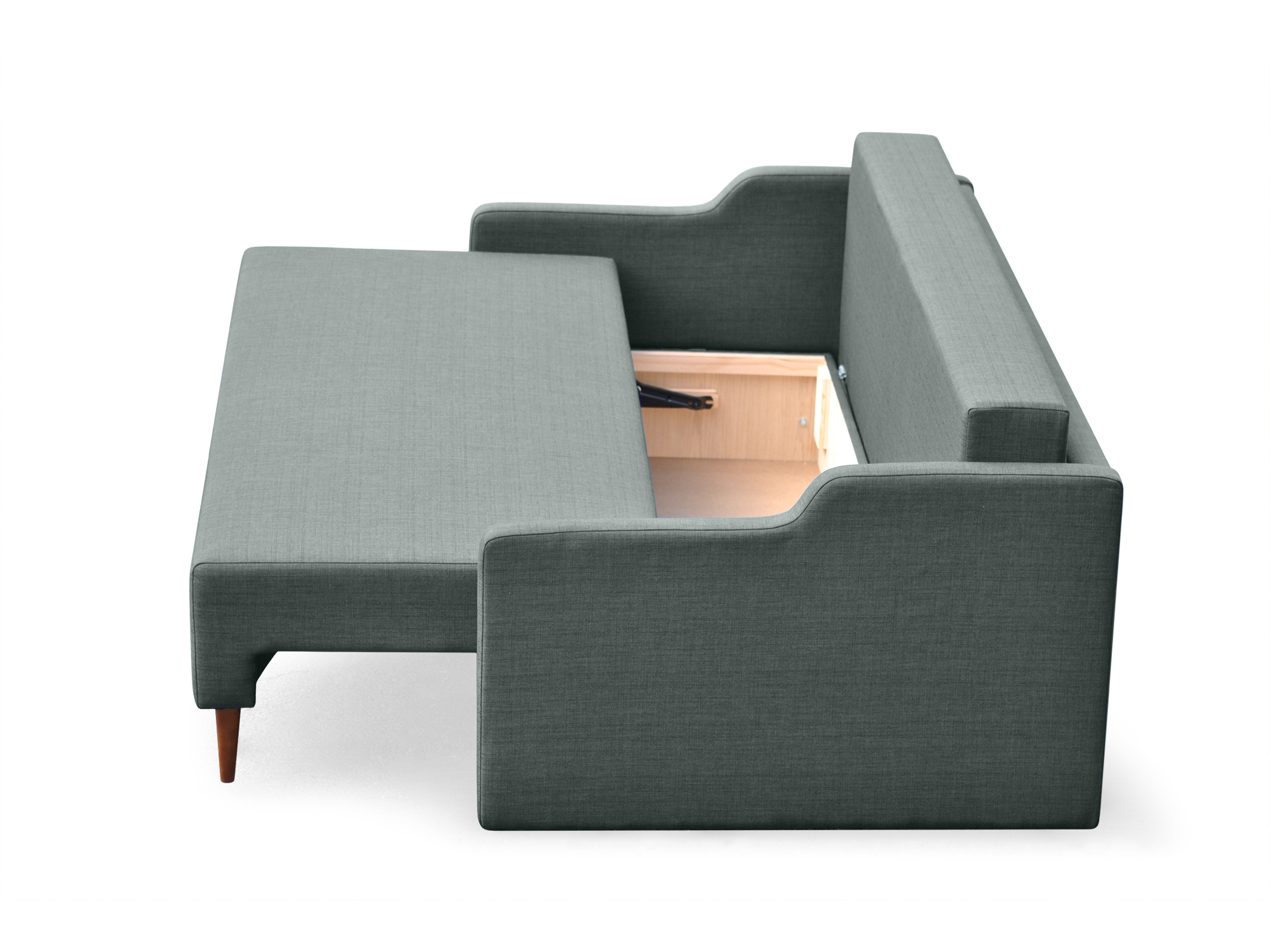 Oslo Sofa Bed in Charcoal utilizes a reliable mechanism that allows the user a simple operation of transforming the couch. Featuring bright fabric upholstery, Mid-Century Modern Sofa Bed will suit any living room set-up. A functional design offers a comfortable place to lounge and relax by day and a cozy surface to sleep at night. A storage space under the seating is a great place for coverlets, pillows and blankets. Minimalist yet refined look of this sleeper is adorned with a mid-century flair, which complement any room interior.